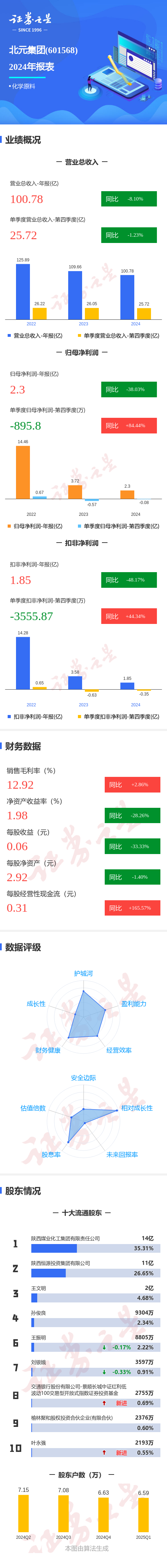 证券之星消息,北元集团2024年年报显示,公司主营收入100.78亿元,同比下降8.1%;归母净利润2.31亿元,同比下降38.03%;扣非净利润1.86亿元,同比下降48.17%;其中2024年第四季度,公司单季度主营收入25.73亿元,同比下降1.23%;单季度归母净利润-895.8万元,同比上升84.44%;单季度扣非净利润-3555.88万元,同比上升44.35%;负债率19.87%,投资收益55.56万元,财务费用-1.24亿元,毛利率12.92%。